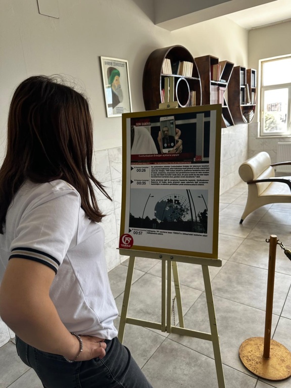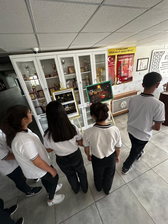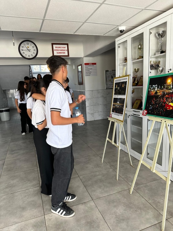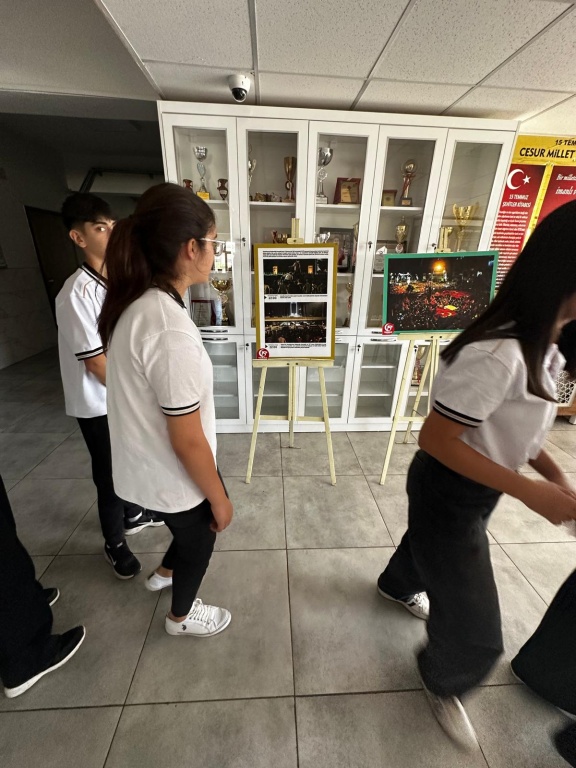 Okulumuzda, 15 Temmuz Demokrasi ve Milli Birlik Günü kapsamında bir etkinlik düzenlendi. Etkinlikte, o geceye ait fotoğrafların yer aldığı bir sergi, okulun çeşitli noktalarında şövaleler üzerinde öğrencilerin ilgisine sunuldu. Tarih öğretmenimiz Ülkü HİÇYILMAZ rehberliğinde düzenlenen sergi gezisinde, öğrenciler hem fotoğrafları inceledi hem de 15 Temmuz’un toplumsal ve tarihi önemi hakkında bilgilendirildi.